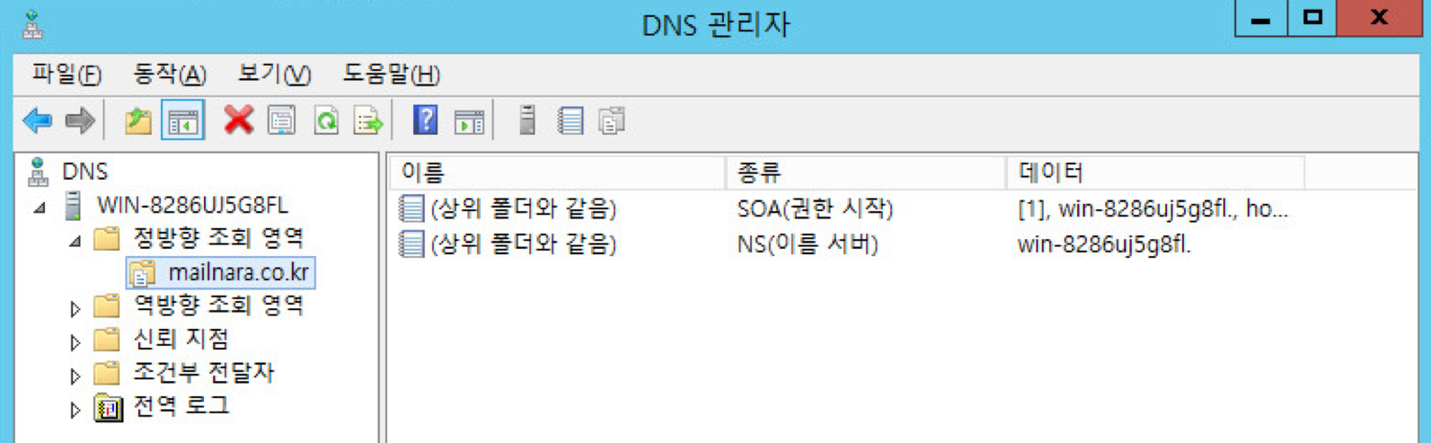 메일나라가 아닌 타사의 네임서버를 이용 중인 고객은 설치 완료 메일에 있는 MX레코드, 메일 서버 IP정보를 네임서버에